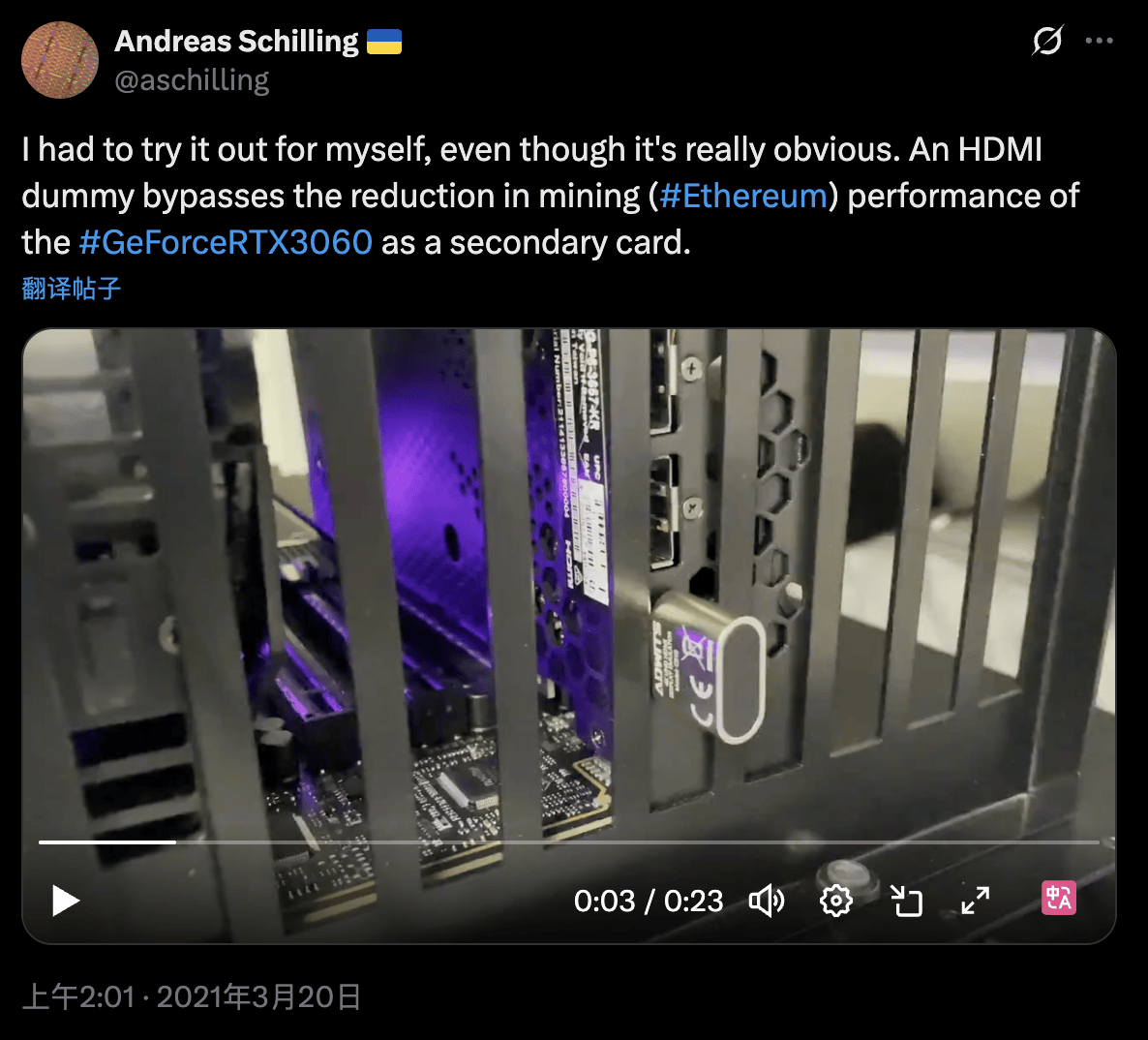 但是显卡持续缺货的现象使得玩家与矿工的矛盾被推到台前。英伟达选择 “双线并行” 的应对,一边给面向玩家的 GeForce(先从 RTX 3060)下调以太坊哈希率,但后来被发现不过是掩耳盗铃,实则上,矿工发现给 RTX 3060 插 “假 HDMI 小尾巴”(dummy HDMI),使其认为其他显卡也在作为显示适配器运行,从而绕过多卡场景下的算力限制,实现全速挖矿。
